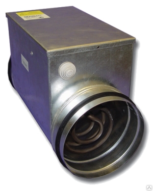 Электрический канальный нагреватель для круглых каналов, корпус и коммутационная коробка изготовлены из оцинкованного стального листа, нагревательные элементы из нержавеющей стали.