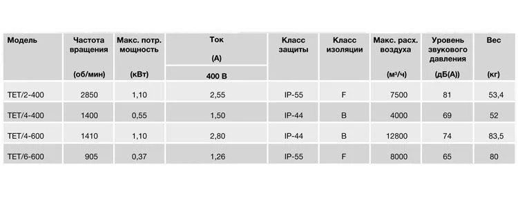 В зависимости от модели, вентиляторы комплектуются 2, 4 или 6 полюсными трехфазными