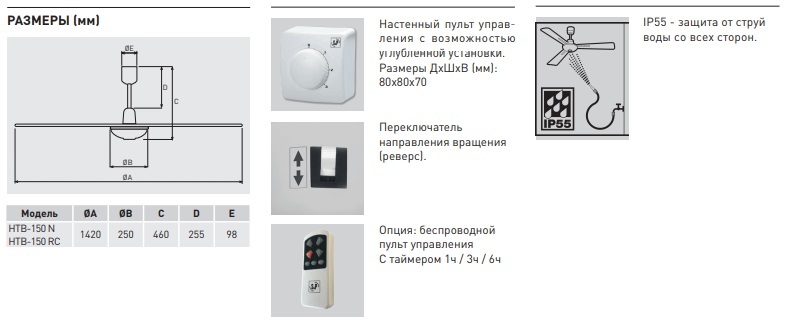 Реверсивные потолочные вентиляторы серии HTB-150N / RC IP55 разработаны специально для работы в сложных условиях, устойчив к коррозии, защищен от попадания пыли и струй воды со всех сторон. Электродвигатели оснащены встроенной термозащитой. Вентиляторы с крыльчаткой диаметром 150 см очень просты в установке, имеют три скорости вращения и трехскоростной настенный проводной пульт управления в комплекте.