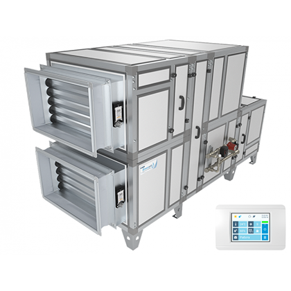 - Приточно-вытяжная установка с роторным рекуператором, фреоновым охладителем, водяным нагревателем и смесительным узлом с 2-х или 3-х ходовым клапаном (узел подбирается исходя из типа водоснабжения).