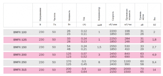 - Вентилятор изготовлен из пластика (модели BFMX 100 – BFMX 200), а у моделей BFMX 250 и BFMX 315 стальной корпус покрытый электростатической порошковой краской.