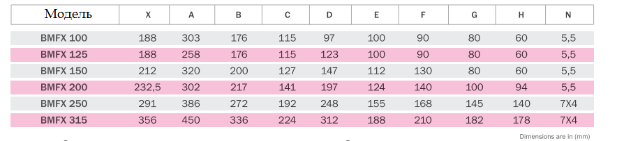 - Вентилятор изготовлен из пластика (модели BFMX 100 – BFMX 200), а у моделей BFMX 250 и BFMX 315 стальной корпус покрытый электростатической порошковой краской.